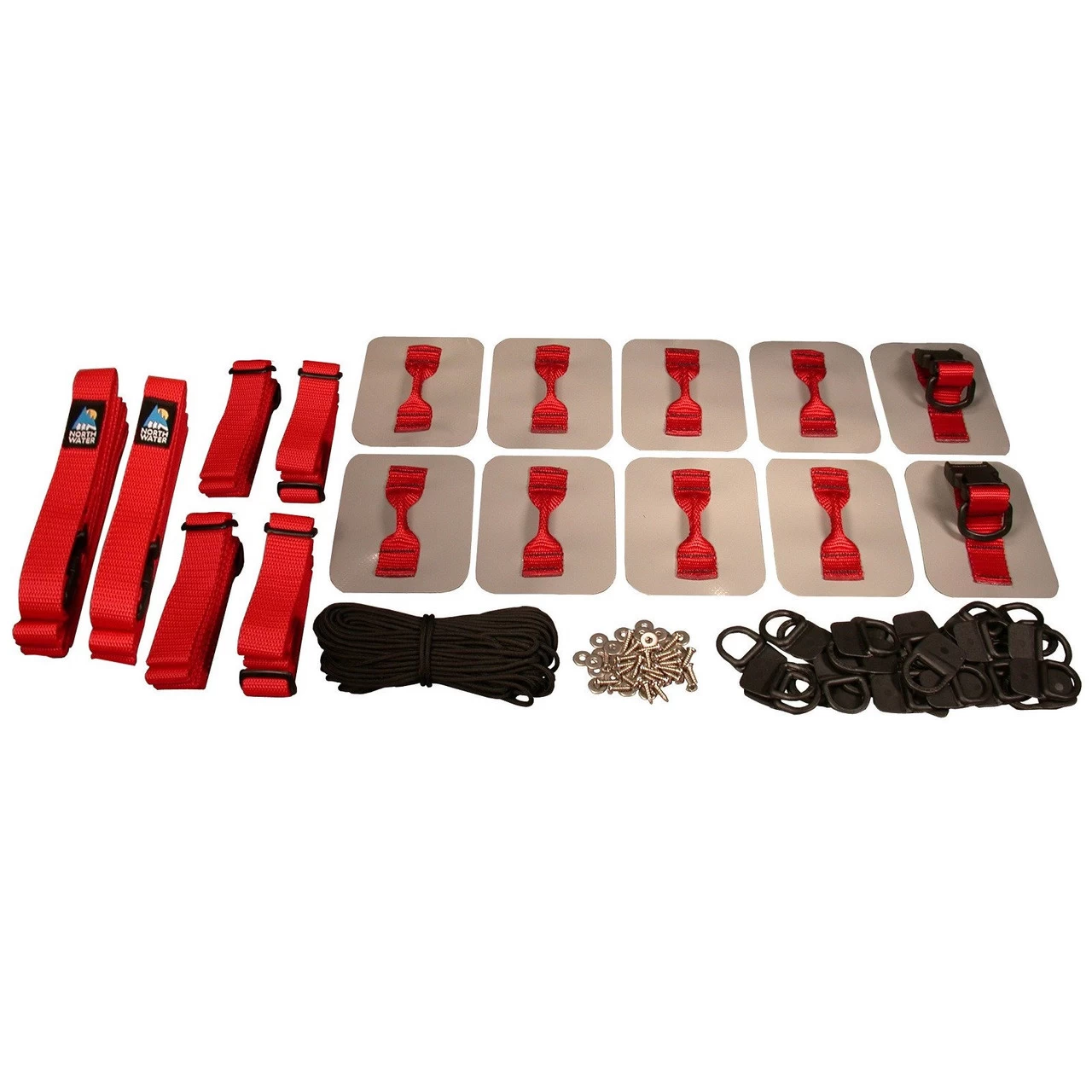 The Airbag Tiedown Kit from North Water this tie down kit can be used to secure two large end bags in a solo boat or two small bow and stern bags and one large center bag in a tandem boat.